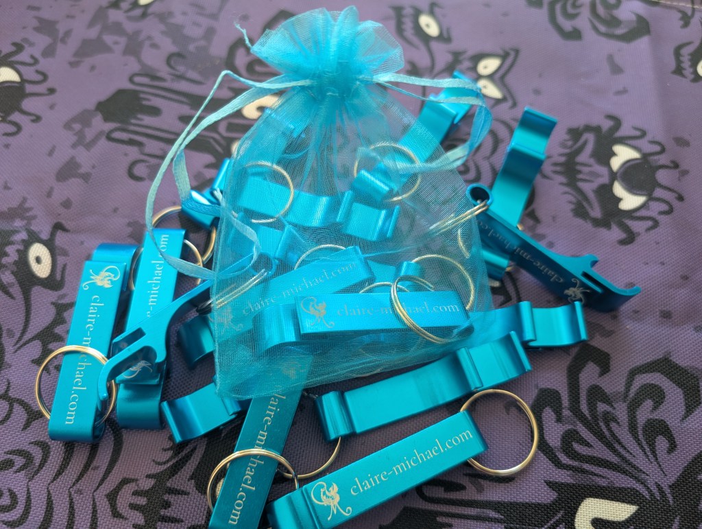 Premium aluminum bottle-opener keychain, with my updated logo and website printed on them. Each keychain comes with an organza storage bag, lovingly packaged and shipped by me. All proceeds will go right back into performing for more people and making more music for YOU!